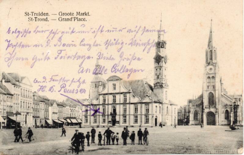Hierboven een postkaart geschreven door een Duits soldaat 'Peusser' vanuit het Hotel Royal tegenover de Minderbroederskerk. De postkaart dateert van 15/12/1914 en hij toonde blijkbaar aan op de kaart waar hij werkte. Tevens kan je zien hoe de Grote Markt er in die periode eruitzag met zijn witgekalkte stadhuis.