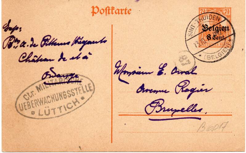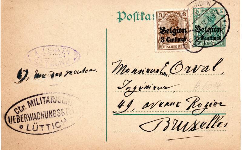 Leunen A uit de Hamelstraat n°17 heeft een betaling van 20 fr gedaan in naam van De Pitteurs-Hiegaerts aan ir Orval uit Brussel. Deze kaart werd verstuurd op 20/10/1917. Bovenaan rechts zie je 2 voorgedrukte bezettingszegels van 3 en 5 cent. Links merk je de Duitse stempel van censuur.