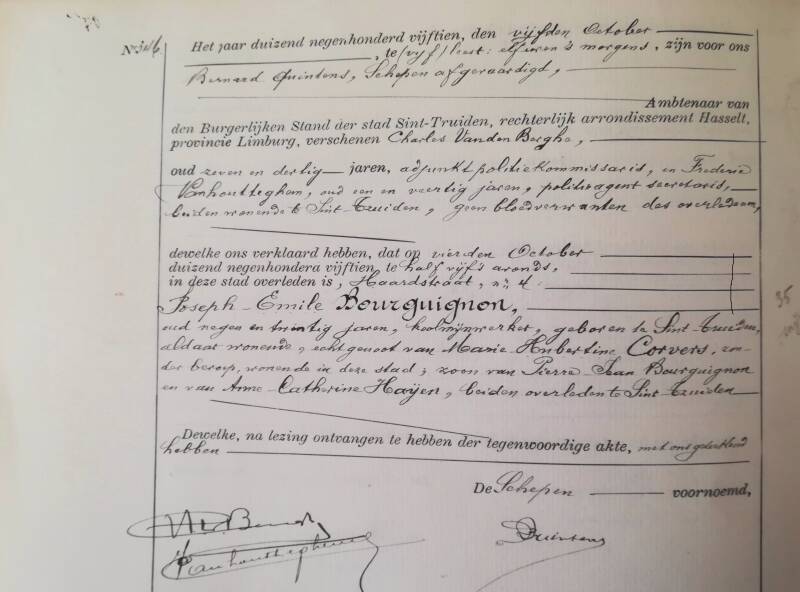 Joseph werd geboren te Sint-Truiden op 03/12/1885 om 23:00. Zijn ouders waren Pierre-Jean (°1842-1902) en Hayen Anne-Catherine (°1853-1905). Hijzelf was gehuwd te Sint-Truiden op 11/05/1908 met Corvers Marie-Hubertine (°1888). Hij was mijnwerker van beroep. Sinds hun huwelijk was het gezin woonachtig in de Haardstraat n°04 te Sint-Truiden. Ze hadden 2 kinderen Julie (°1908-1991) en Antoine (°1911-1969)