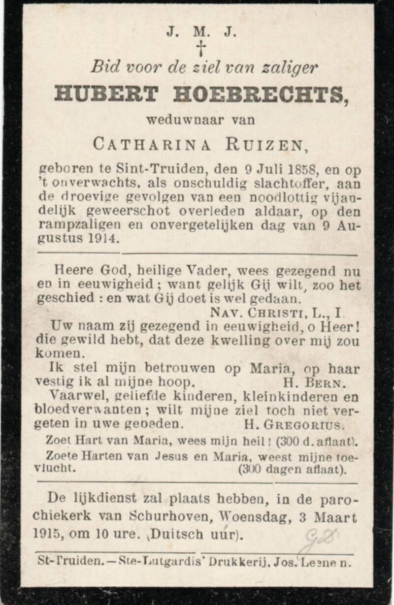 Op de bewuste dag van 09 augustus 1914 werd Hubert in de Schurhovensteeg rond 18:00 neergeschoten door Duitse verkenners toen hij op weg was naar huis. Hij kreeg een kogel in de heup.