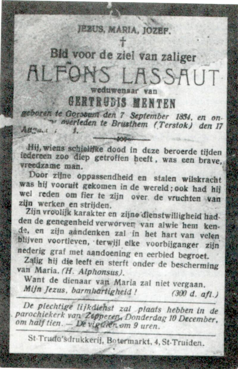 Gedenkplaat te Brustem (gemeenteplein) doodsprentje (Lassaut Alphonse)