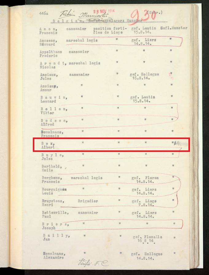 Tijdens de mobilisatie werd hij ingedeeld als soldaat 2e klas bij de Vestingartillerie van Luik, meer bepaald het fort van Lantin. Tijdens de gevechten aan de Luikse forten werd hij op 15/08/1914 krijgsgevangen genomen en afgevoerd naar het gevangenkamp in Munster en Soltau (Duitsland). Zijn stamnummer was 36397.